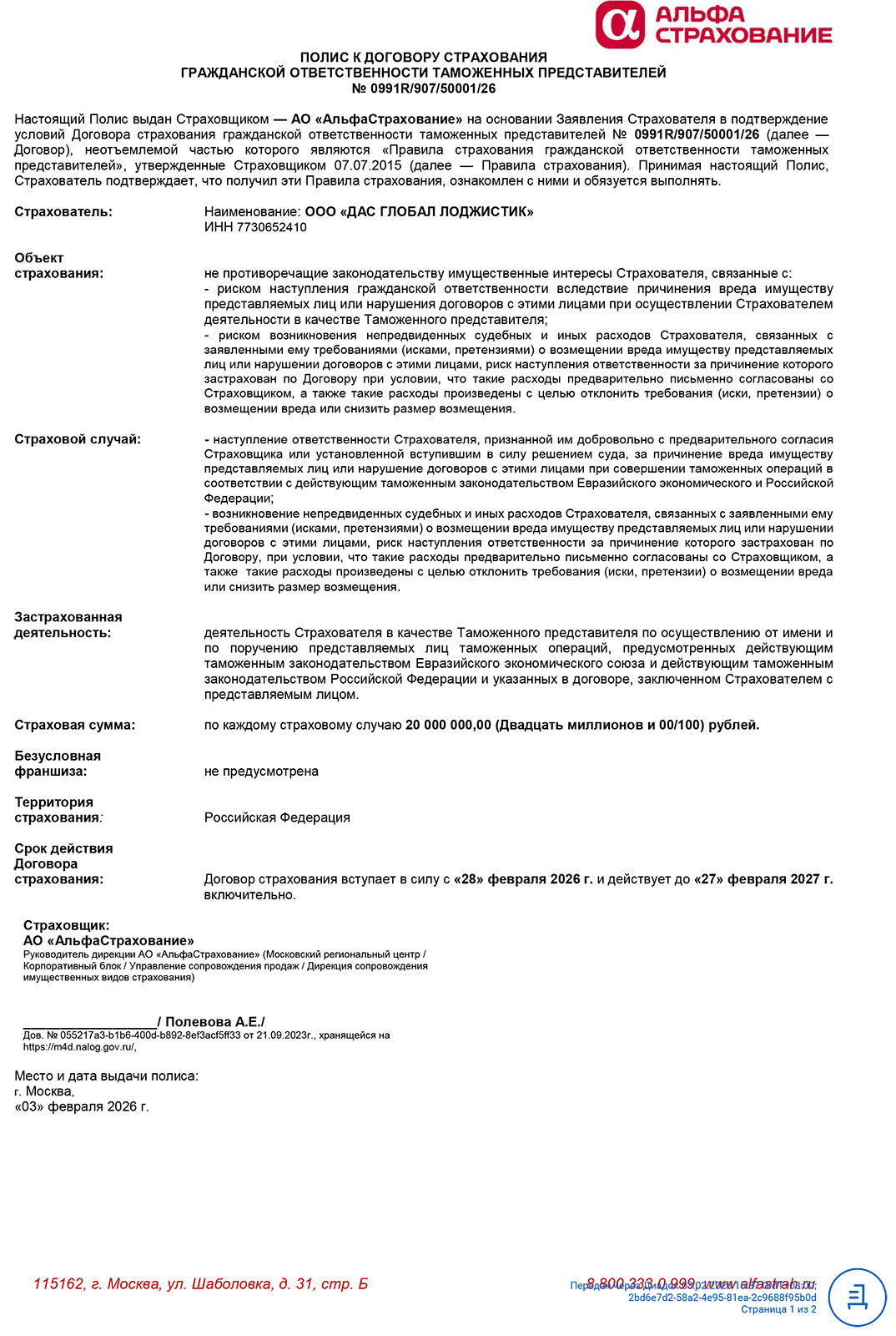 • Страховой полис (АО «АльфаСтрахование») № № 0991R/907/50001/26 от 28 Февраля 2026 г. – страхование гражданской ответственности при осуществлении деятельности таможенных представителей.